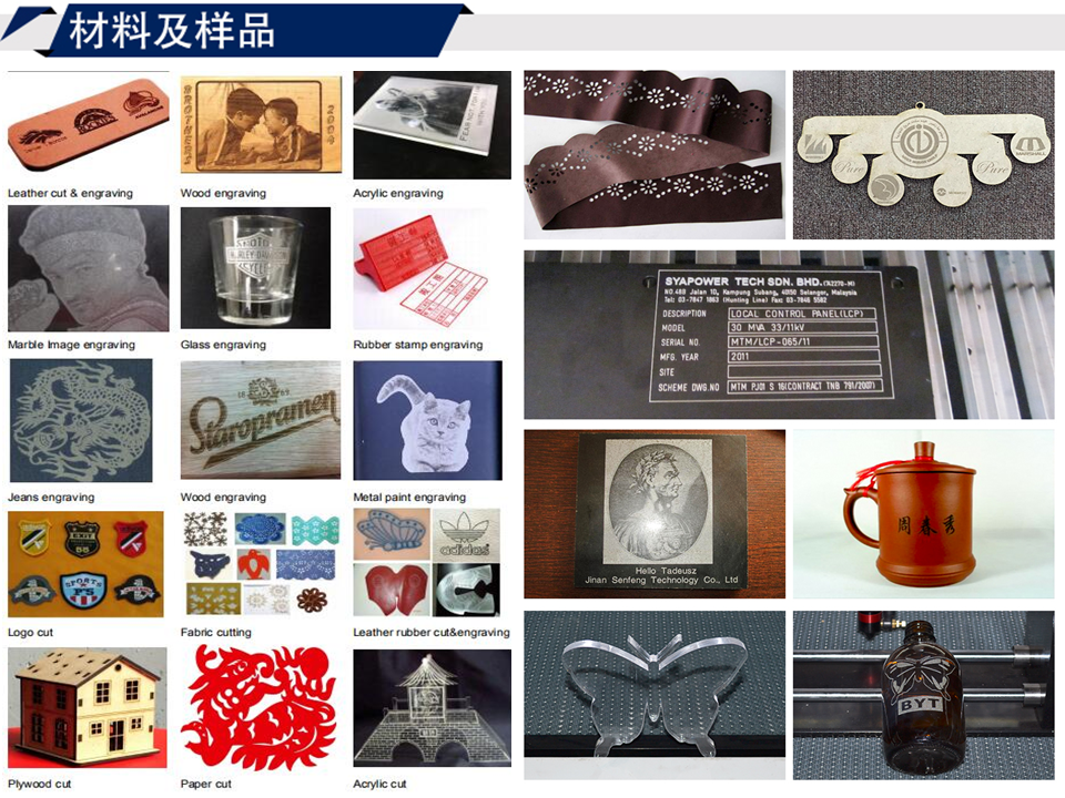 工藝品,家具,玻璃制品,木制品,聚氯乙烯,燈飾,廣告,裝飾,造紙,馬克板,郵票及印章,腈綸,竹制品,手帶及鞋子,衣服和服裝,面料等。通過對激光參數(shù)的調(diào)整,機器可以進行多樣的雕刻和切割。這個機器具有很多優(yōu)點:切口光滑,無接觸切割,高速雕刻,雕刻準確、效果好。